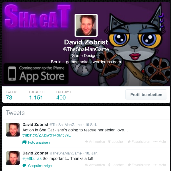 I aligned all Marketing Channels now to represent „Sha Cat“ only, leaving my first game project „The Sha Man“ back and giving the stage to the Cat.