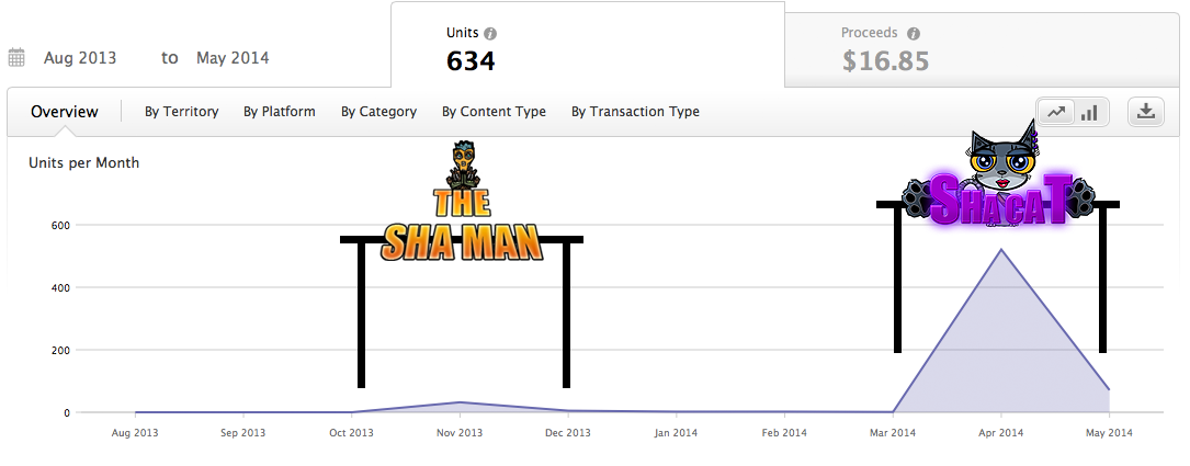 Units per month shows the amount of downloads. Consider that „The Sha Man“ was priced and had no marketing.
